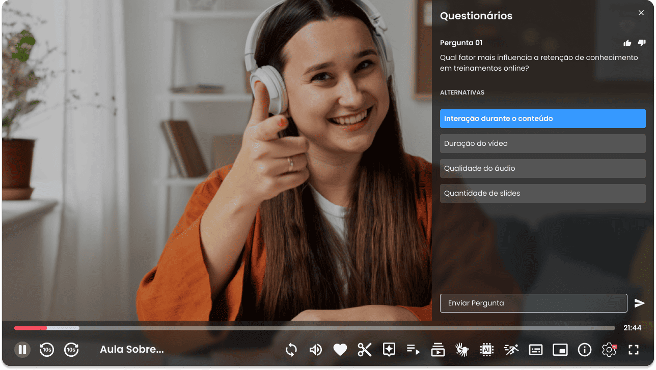 Disponibilize perguntas diretamente no player durante a transmissão. O público responde em tempo real, participa ativamente e se mantém engajado durante todo o conteúdo. Streaming deixa de ser passivo e se torna participativo.
